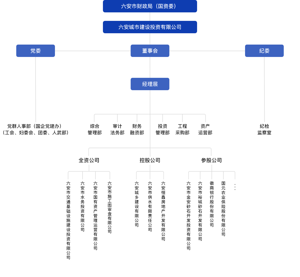 公司全資二級公司4家,分別為:六安市交通基礎(chǔ)設(shè)施建設(shè)投資有限公司、六安市水務(wù)投資有限公司、六安市國有資產(chǎn)管理運營有限公司、六安市施工圖審查有限公司。三級公司12家,分別為:六安路宇淠河大橋開發(fā)有限公司、六安市交投產(chǎn)業(yè)運營管理有限公司、六安建設(shè)發(fā)展有限公司、六安市城鄉(xiāng)建設(shè)有限公司、六安市六舒產(chǎn)業(yè)投資有限公司、六安市砂石開發(fā)投資有限公司、六安市潔康環(huán)保醫(yī)療廢棄物集中處置有限責(zé)任公司、六安市小額貸款有限責(zé)任公司、六安市新能源智慧停車服務(wù)有限公司、六安市石寶山陵園開發(fā)有限公司、六安市城建資產(chǎn)經(jīng)營管理有限公司、六安市樂居商業(yè)運營管理有限公司。控股公司3家,參股公司20家。